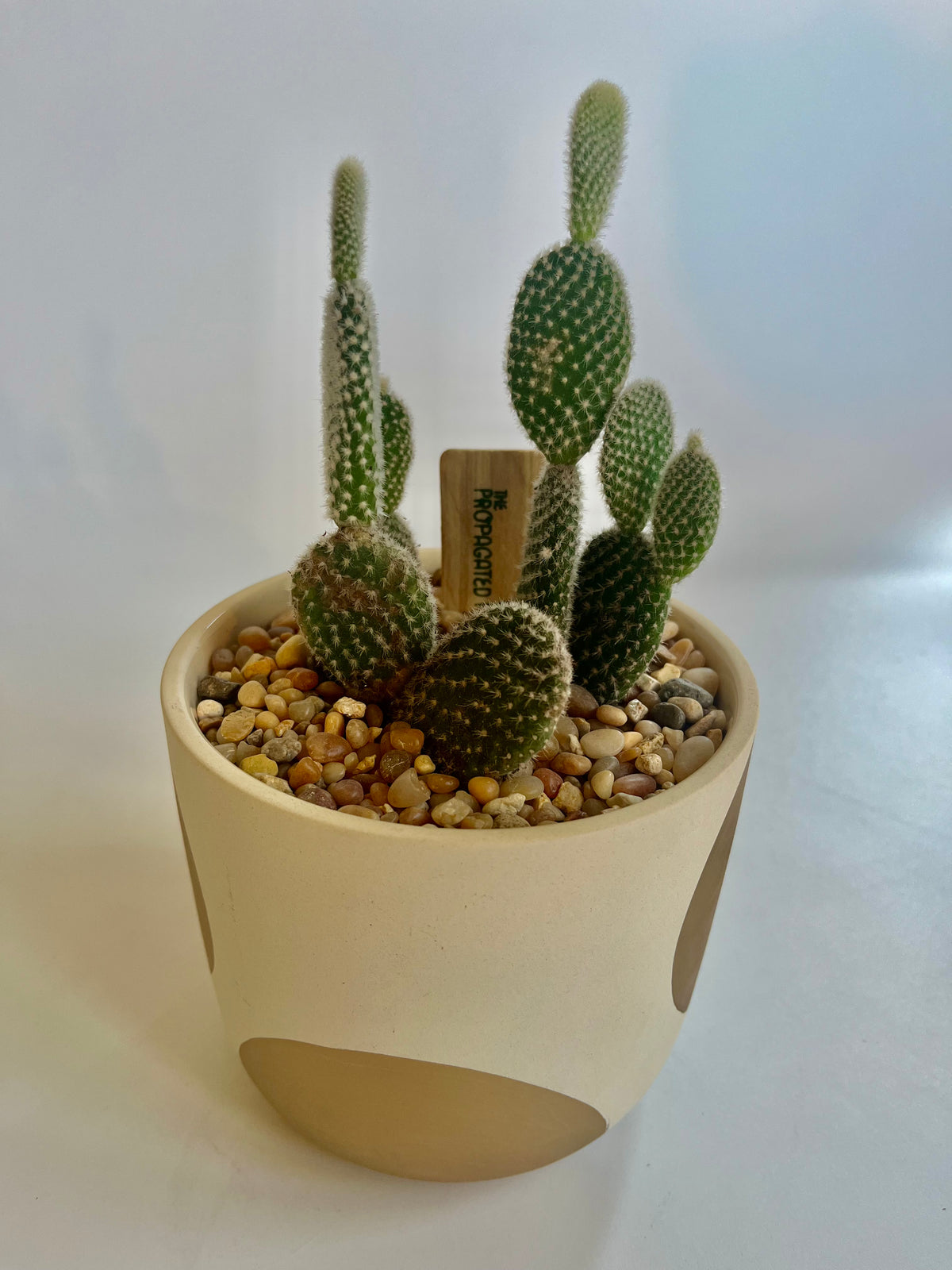 Bunny Ears Cactus (Opuntia microdasys) in a ceramic gold circle planter with multicolored stones and clear quartz (Copy)