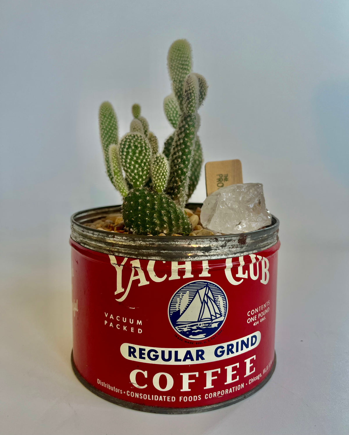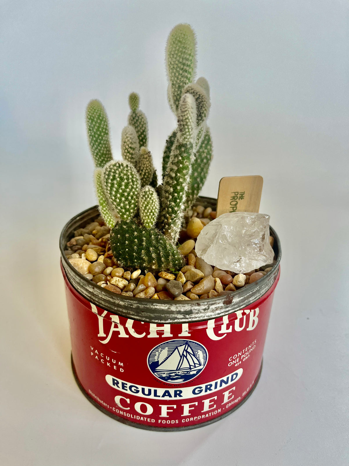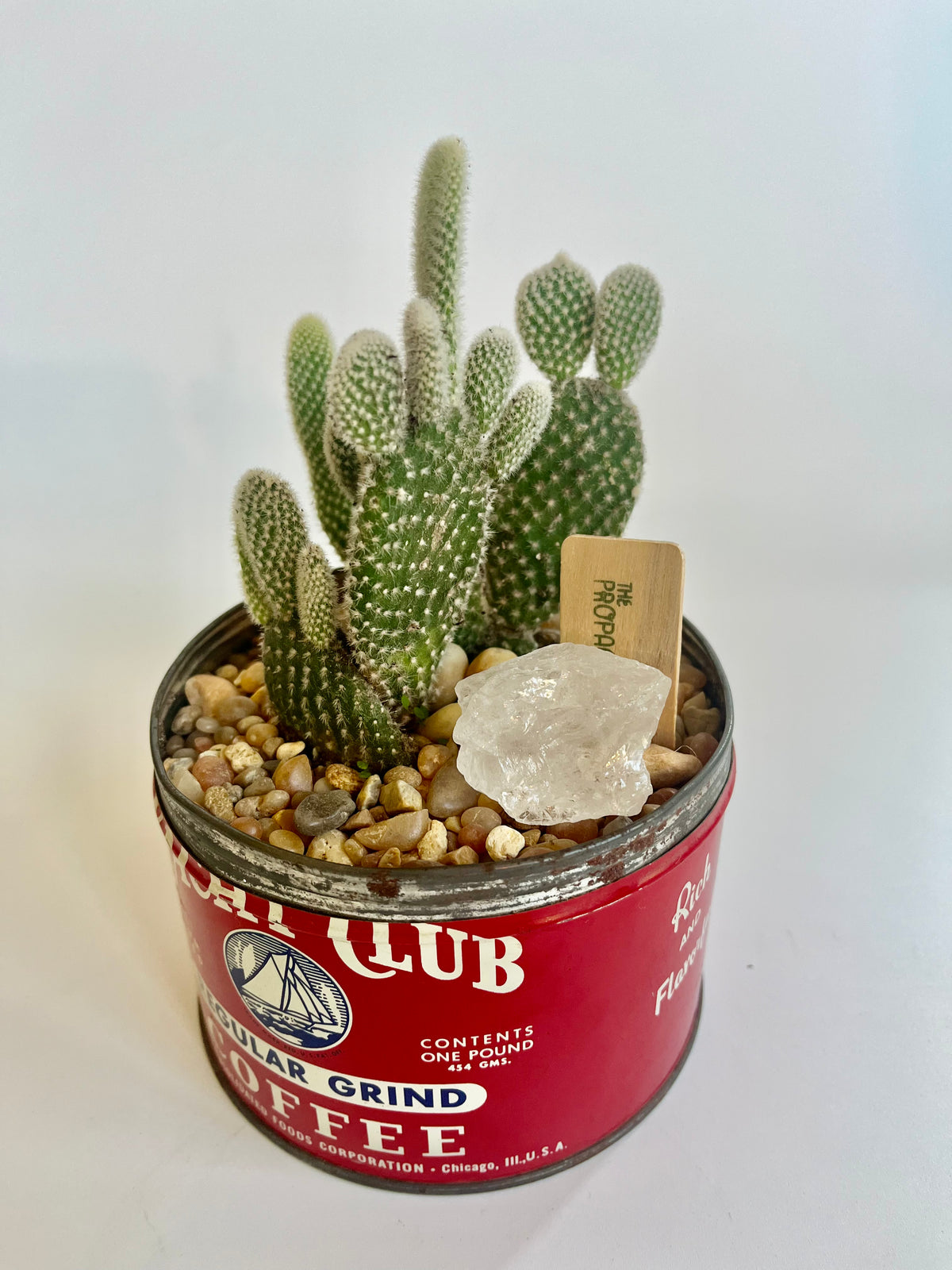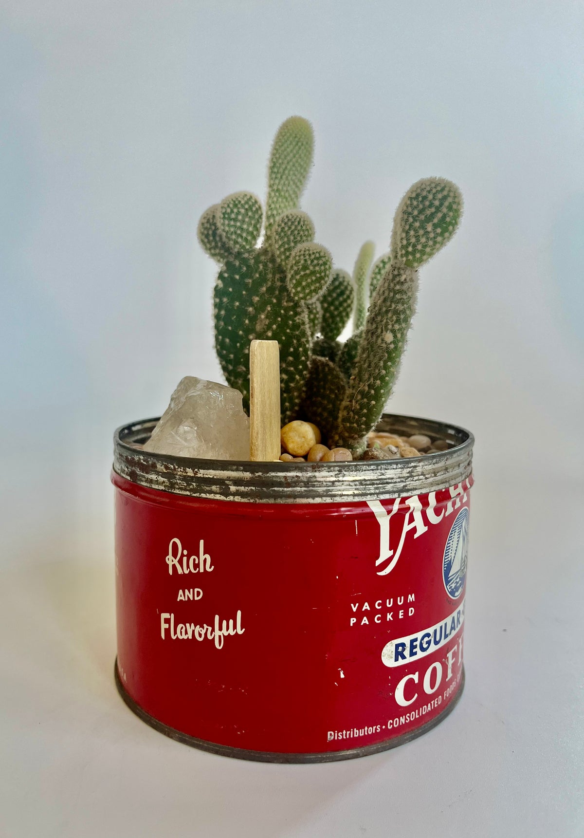 Bunny Ears Cactus (Opuntia microdasys) in vintage Yacht Club Coffee vessel with multicolored stones and clear quartz