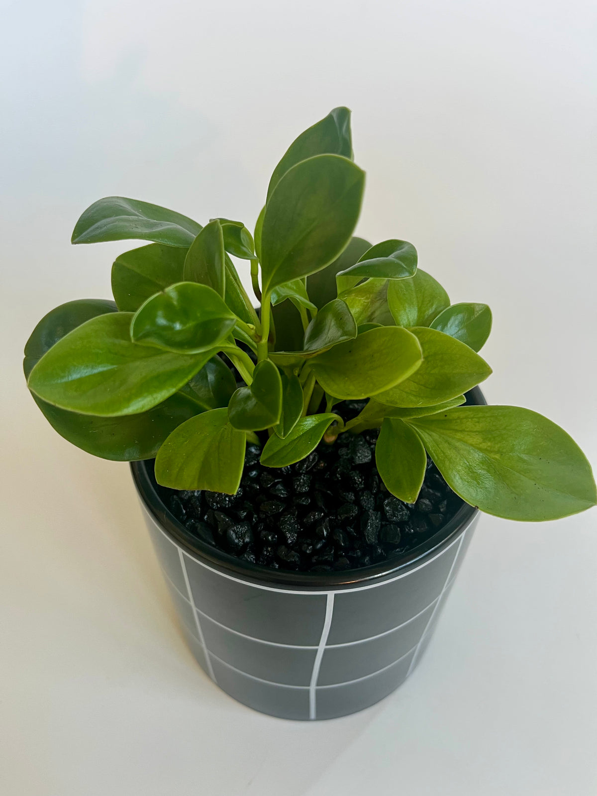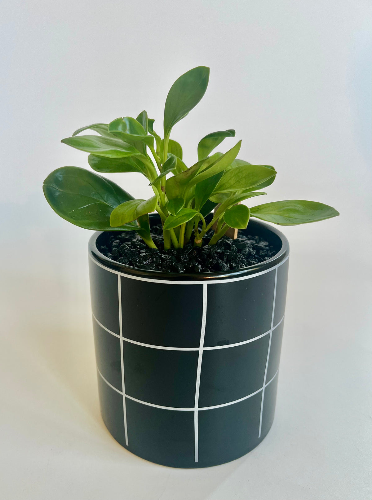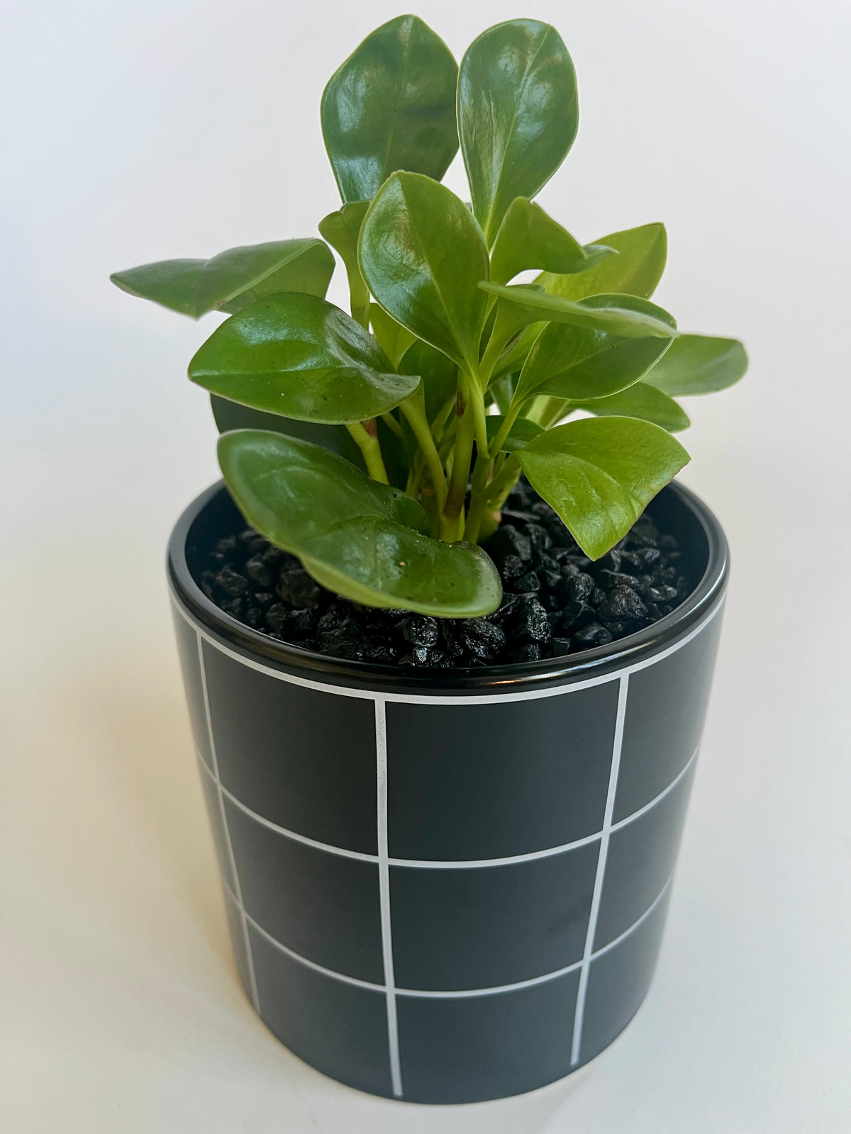 Peperomia "Thailand" in a ceramic black with white large checkered planter with black stones