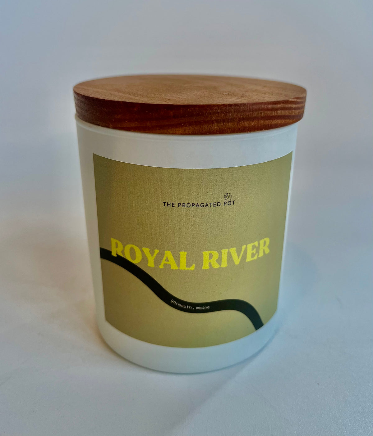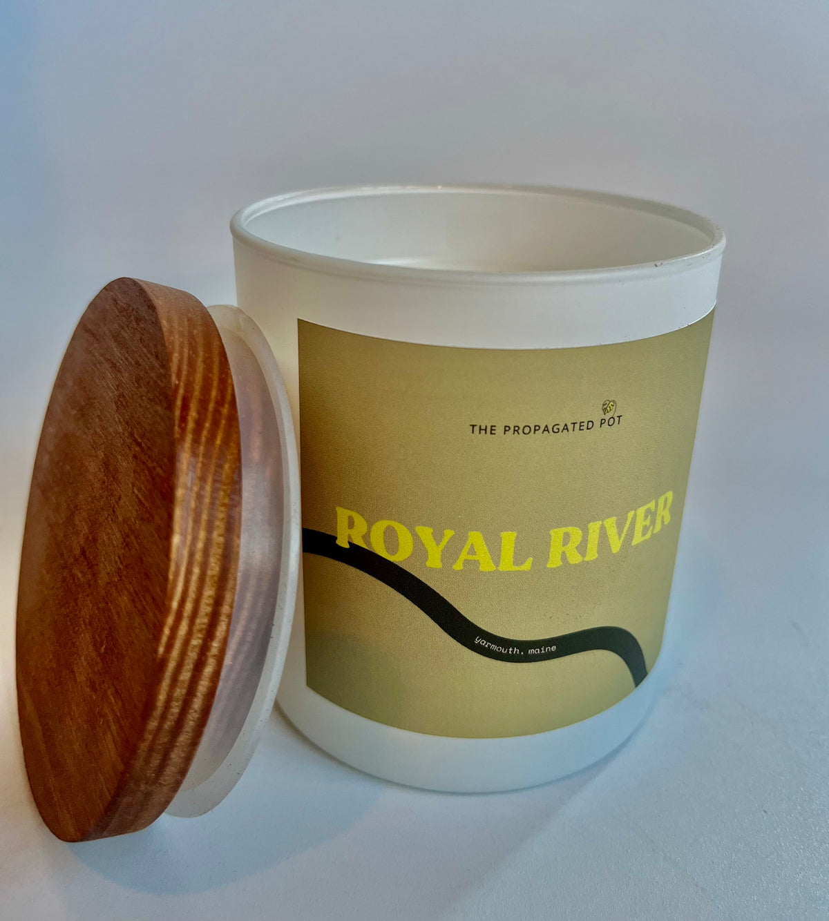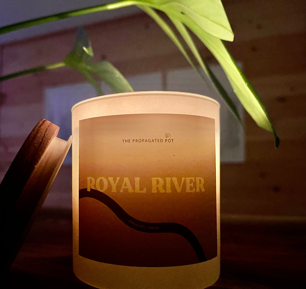 Royal River features scents of sage, spruce, balsam, and smoke. A nod to our new(ish) Yarmouth roots and the river that runs through them.