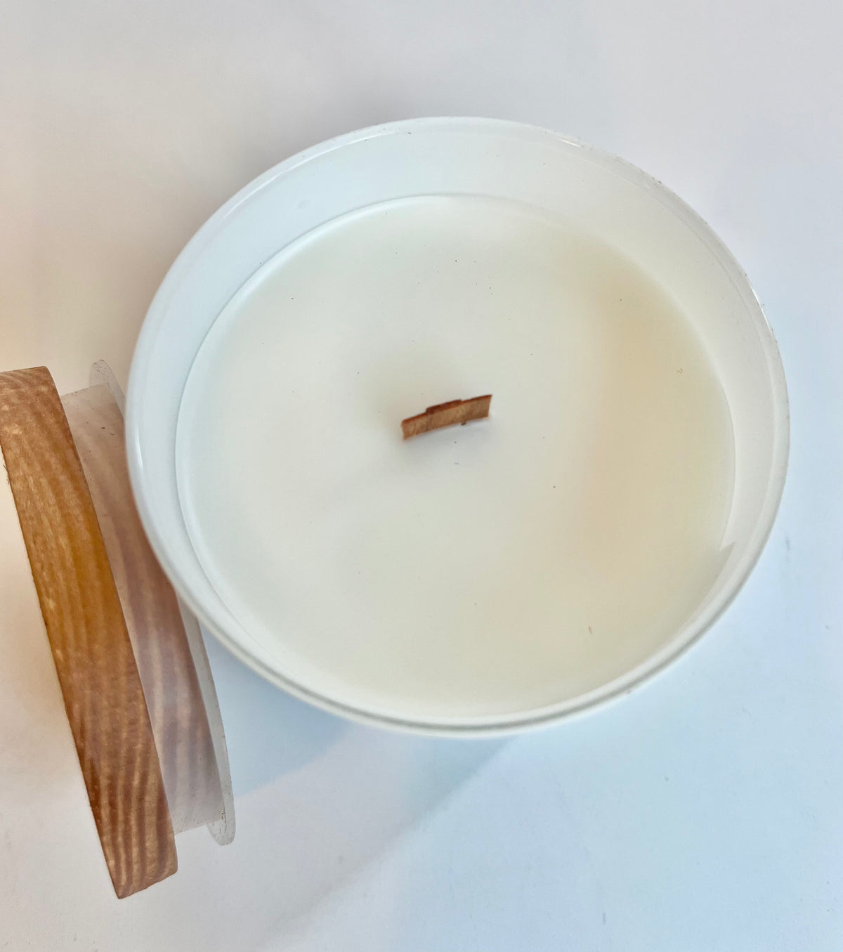 Each candle is made with a proprietary blend of virgin coconut creme wax and natural sox wax. These candles are lightly scented, clean burning, sustainable, and refillable with a wooden wick. When your candle has flickered it's last flame simply visit the website on the label on the bottom of the candle to begin the refill process.