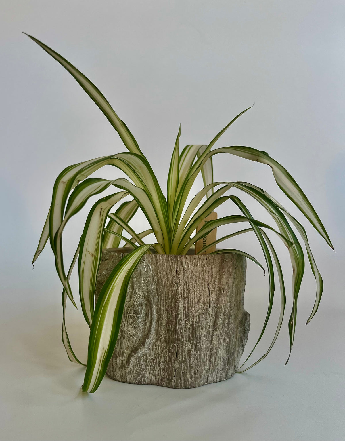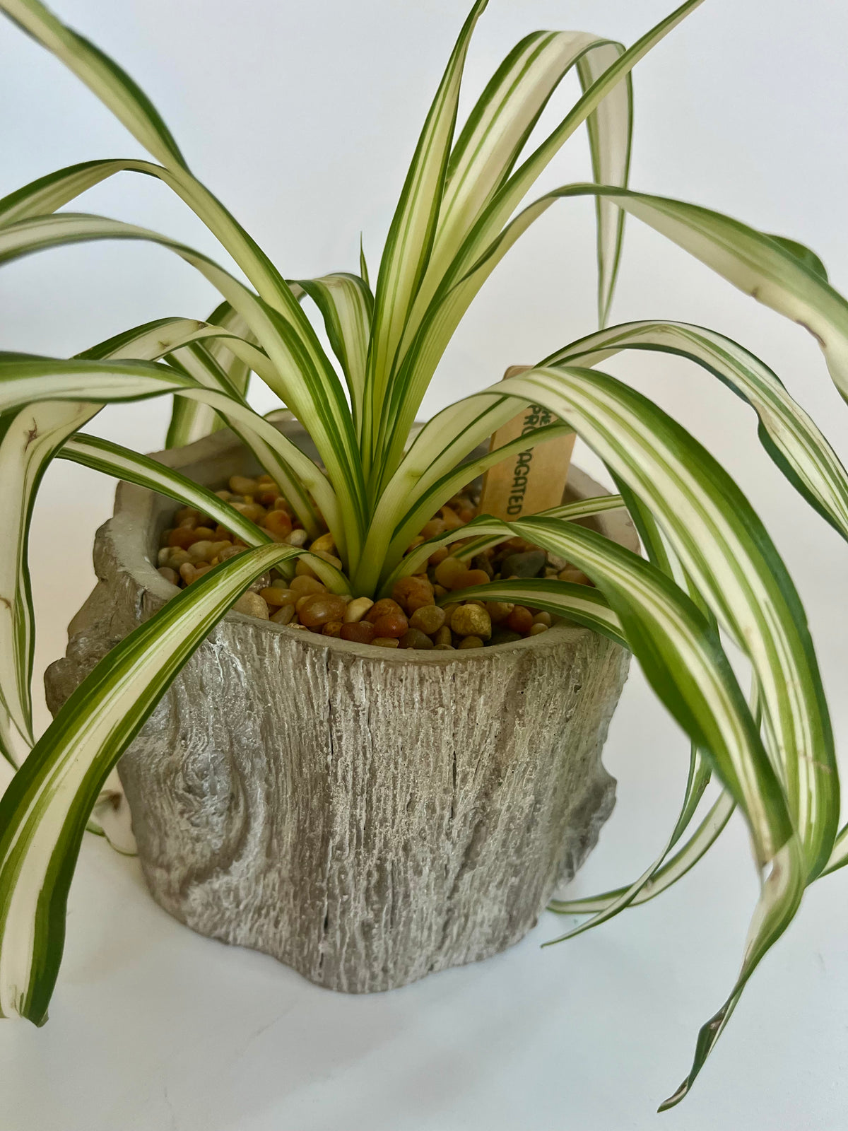 Spider plant (Chlorophytum comosum) in a ceramic "tree trunk" with multicolored stones